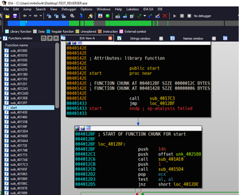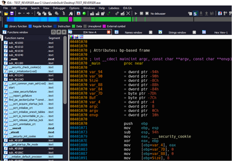 IDA 7.0 nhận diện được hàm main cũng các hàm thư viện – Khung Funtions Window nằm bên trái màn hình