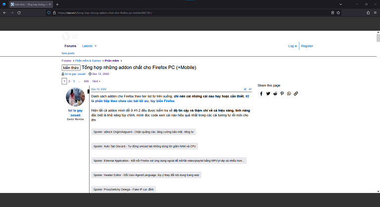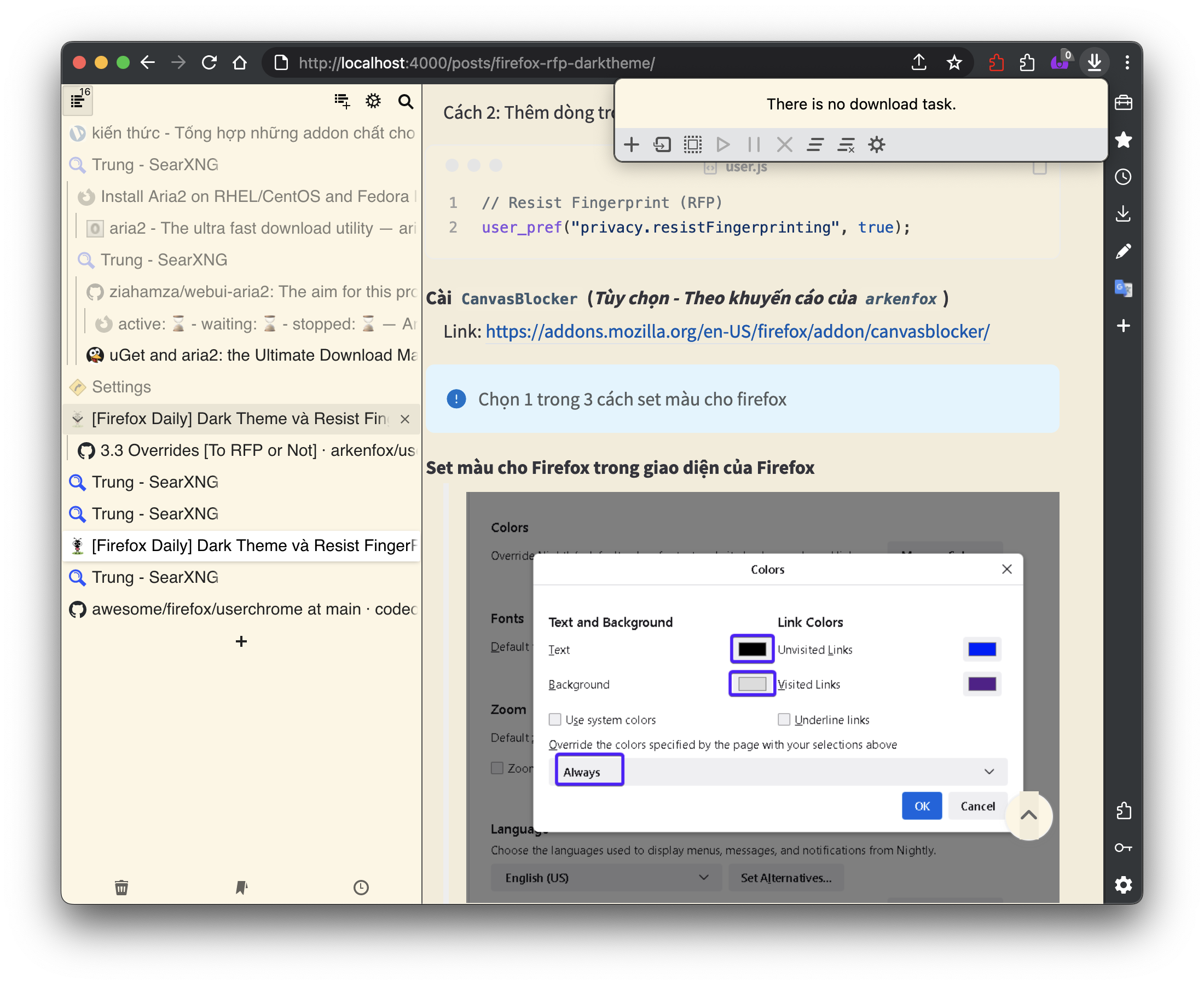 Chuyện là Firefox có tham số privacy.resistFingerprinting để kích hoạt chế độ chống ghi dấu trình duyệt (finger printing, dịch ra bựa vãi - đại khái là nó sẽ đánh dấu trình duyệt để nhận dạng, định danh người sử dụng). Chuyên sâu hơn, thì user.js của arkenfox còn có riêng 1 section dành để chống fingerprinting, mà có thể sẽ làm cho trải nghiệm duyệt web “nhạt toẹt”: đóng hộp, trắng tinh, không màu sắc, không mùi vị. Tác dụng (phụ?) của cái privacy.resistFingerprinting là ép website chỉ hiển thị light-theme, hay thậm chí là xóa sạch các loại hiệu ứng màu sắc của website. Vẫn biết càng bảo mật thì càng khó dùng, nhưng dark theme đang là trend, thì liệu có giải pháp nào để tô đen cho website trong khi đang được bảo vệ?